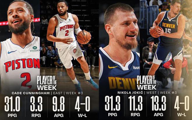在这轮比赛之前,NBA官方公布了上周的周最佳球员,坎宁安和约基奇分别当选。其中,坎宁安上周率球队取得了4胜0负,场均可以得到31分3.3篮板9.8助攻。约基奇上周率球队取得了4胜0负,场均可以得到31.3分11.3篮板13.3助攻。坎宁安这赛季进化还是很明显的,打得是更有自信了,对抗提升的同时,在场上失误数减少,关键时刻打得往往特别强硬。而约基奇,不愧联盟现役即战力第一人啊,划划水就能拿到场均三双,得分、篮板、助攻一把抓;本赛季,约老师估计又要和亚历山大,字母哥他们竞争MVP了。